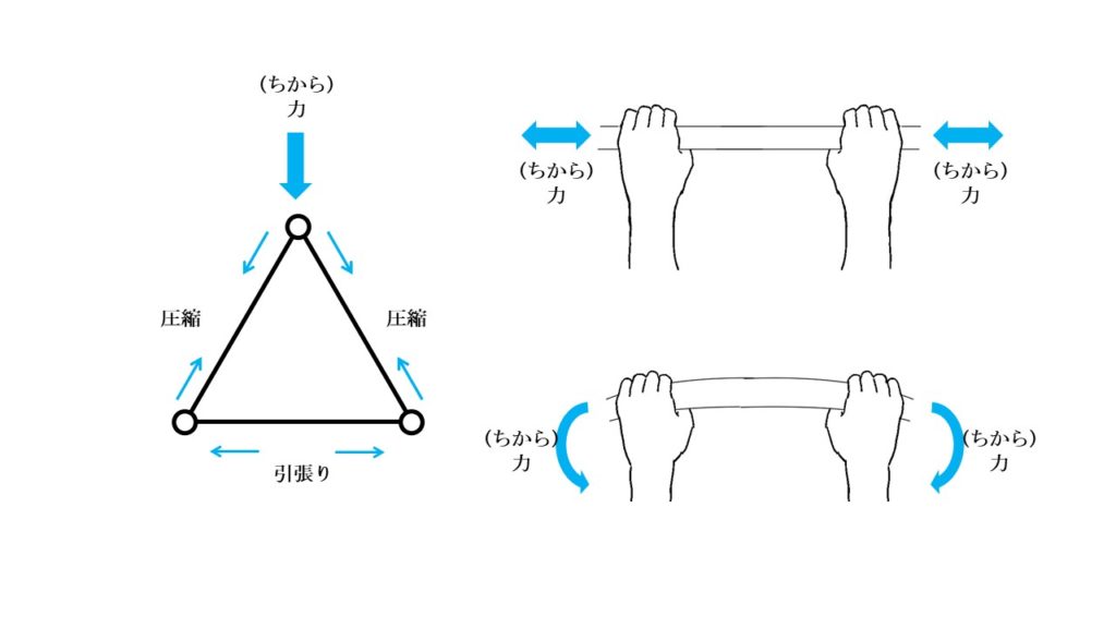 簡単なイメージですが、木の棒に曲げる力をかけると簡単に折れてしまいますが、