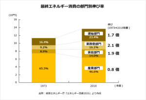 全体として増加しており、家庭部門では1973年と比較し、約2倍となっている。