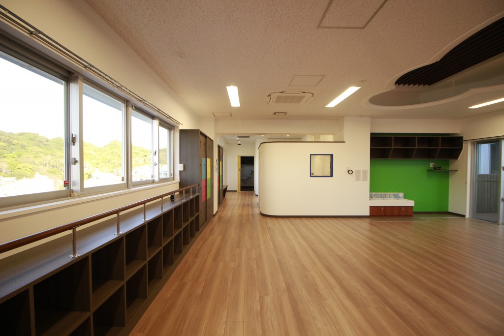コールセンターに併設された事業所内保育園です。子供たちに首里の空、風、日の光という自然を感じさせながら、心豊かに健やかに育ってほしい。~子どもが毎日来たくなる、いきいきする保育所づくり~というコンセプトで作り上げました。